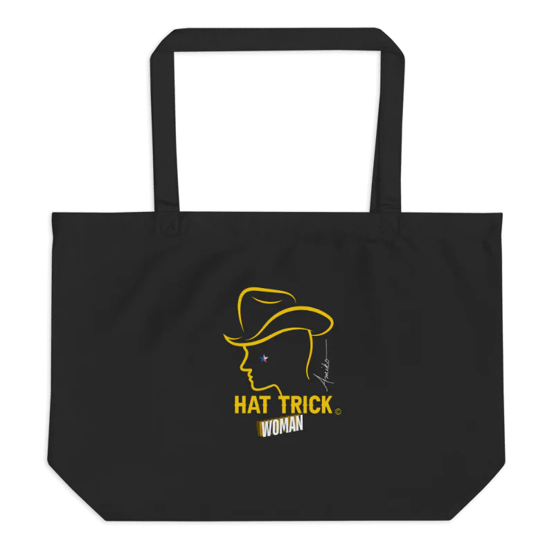 Hat Trick “Woman” Large BlackTote, Amiko’s Graphic Art expressing her love of western flare, soccer, music and fashion! It’s great for multiple uses and errands, shopping and its an attention grabber too!